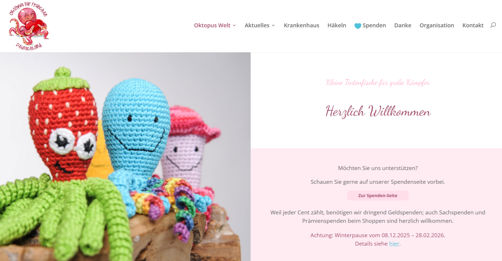 A well-known social crochet initiative is the Oktopus für Frühchen Deutschland gemeinnützige GmbH preemie octopus project. Volunteers crochet small octopuses that are donated to neonatal intensive care units (NICUs) for premature babies. The organization provides an official crochet pattern and safety guidelines that must be followed.