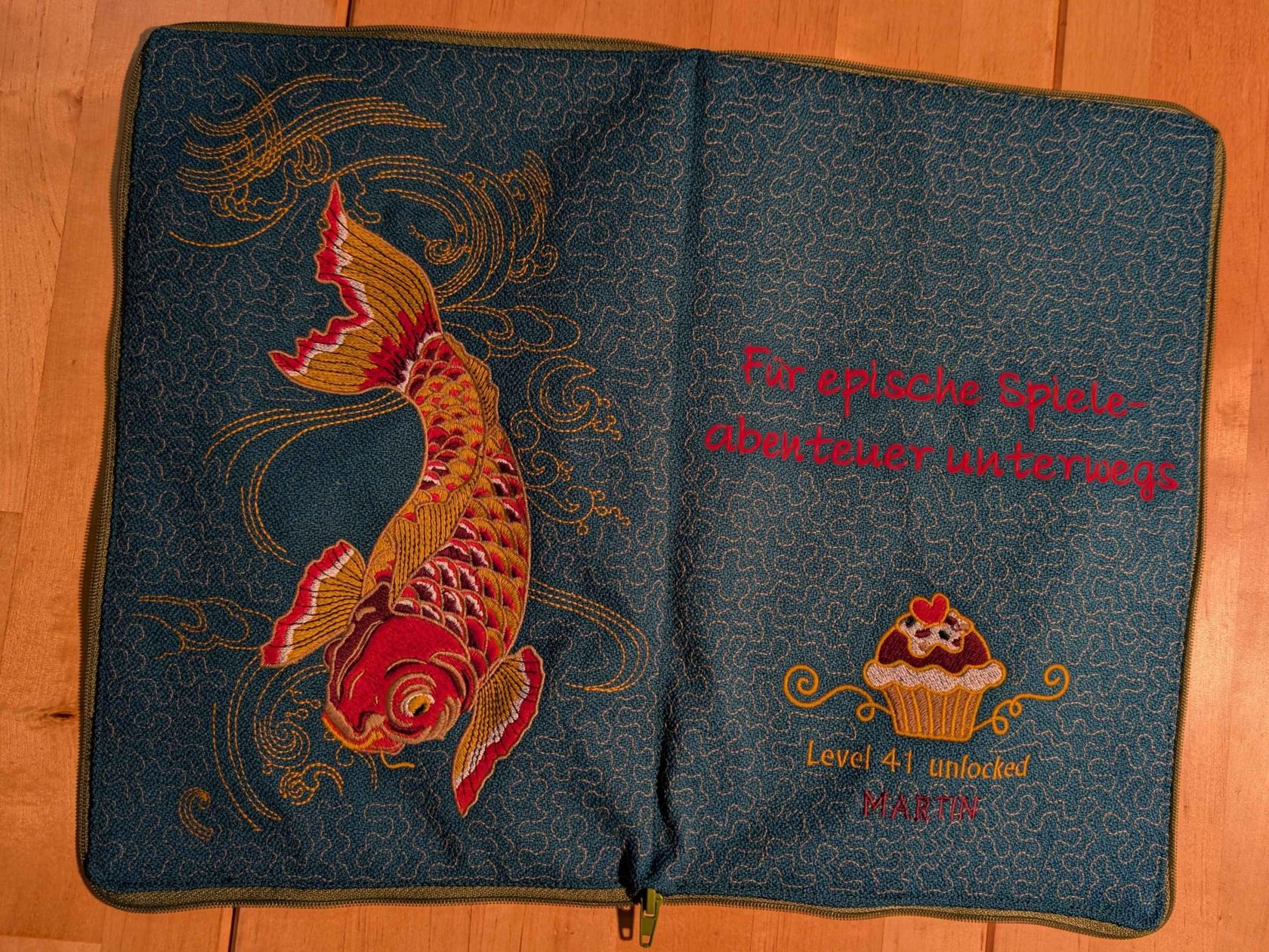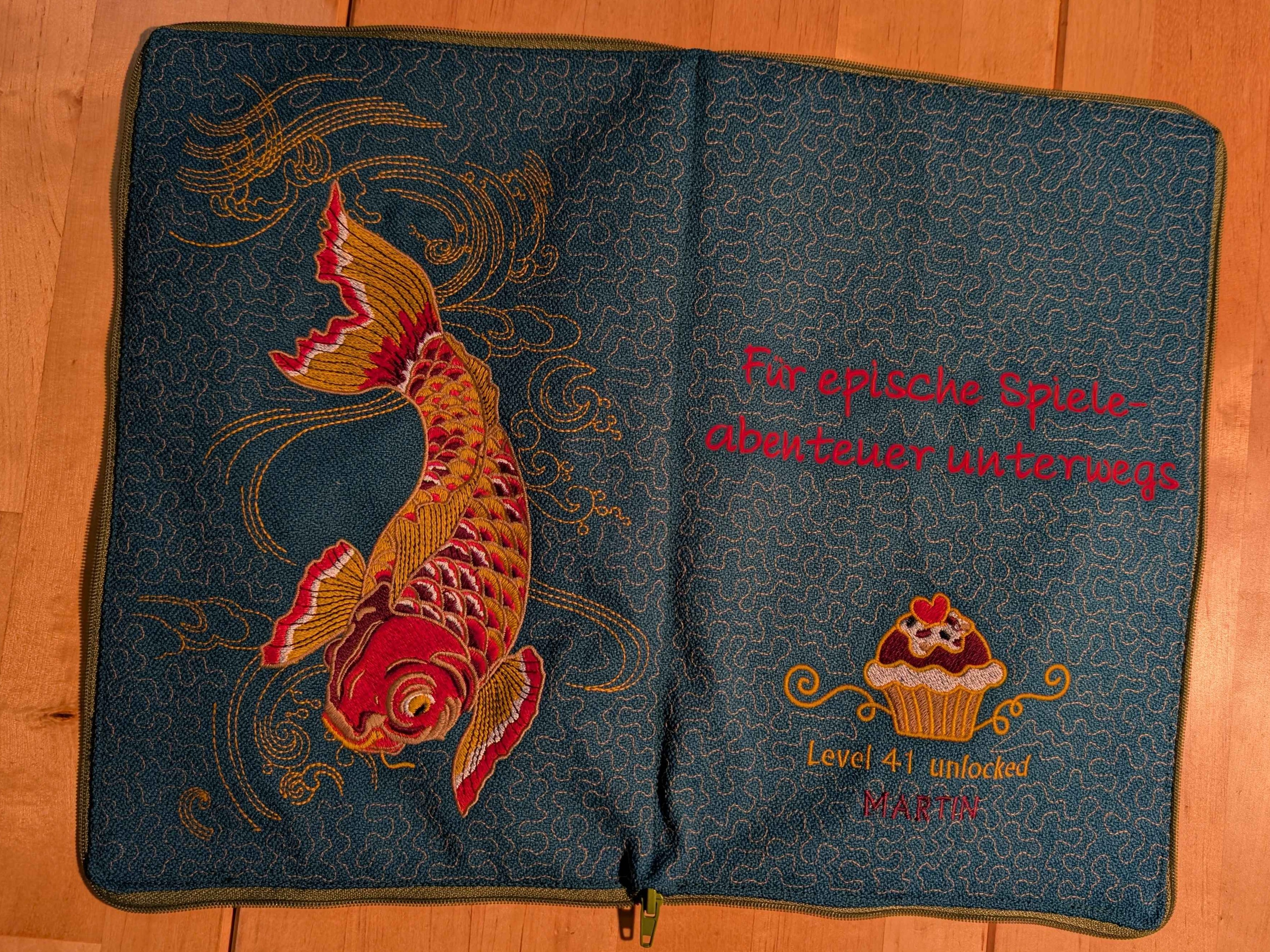 I sewed a bag that fits the game perfectly and makes it easy to take along while traveling. To make it truly unique, I embroidered the outside using our Brother embroidery machine. The bag is fully lined on the inside, giving it both structure and a clean finish.