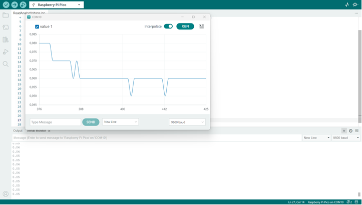// the loop routine runs over and over again forever: void loop() { // read the input on analog pin 0: int sensorValue = analogRead(26); // Convert the analog reading (which goes from 0 - 1023) to a voltage (0 - 5V): float voltage = sensorValue * (5.0 / 1023.0); // print out the value you read: Serial.println(voltage); delay(100); }