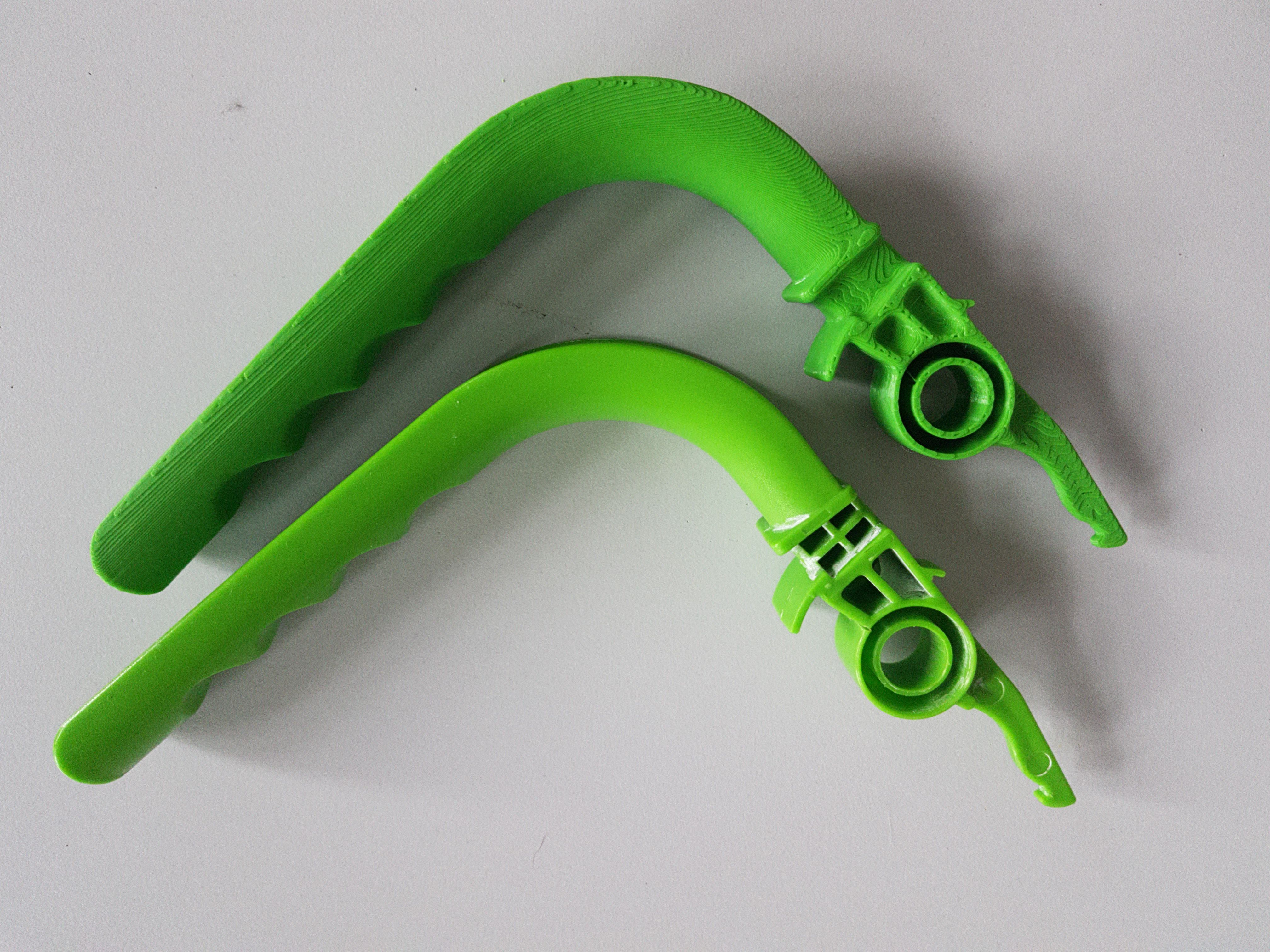 The first version was lacking the groove in the handle, so we printed a second one in the right color.