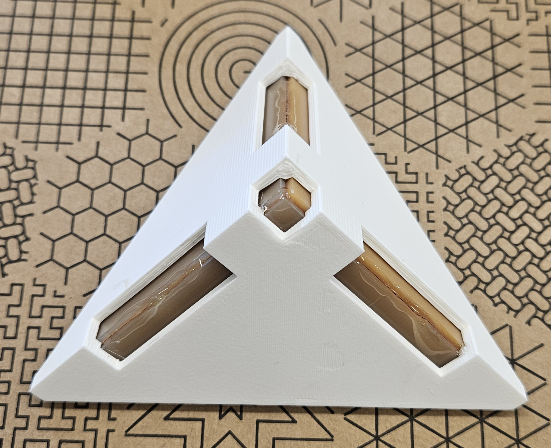 The jig has several cutouts. These are used to glue the triangles together. The jig is made for plates of 1.6 mm thickness. The FreeCAD files and STL files are attached to this page.