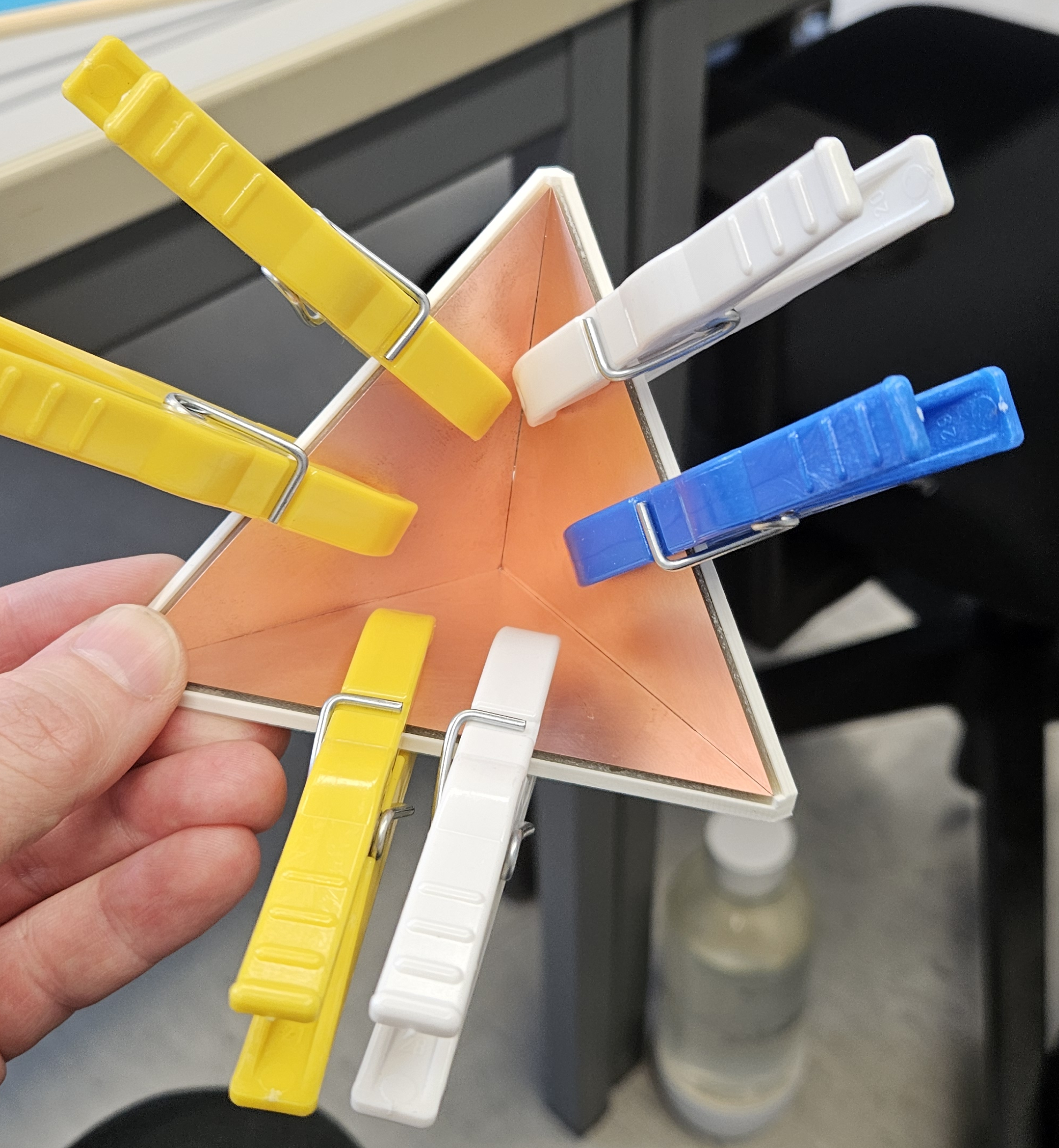 The triangles are glued together by inserting them into the jig and fastening them using clothespins.